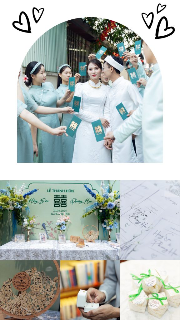 Chúng tôi tự thiết kế thiệp cưới cho riêng mình, cô dâu tự mình chọn váy cưới, tự làm nhẫn cưới design riêng. Chúng tôi còn loay hoay tìm nơi đặt bánh cưới, đặt hộp quà cưới, đem về, mấy chị em lúi húi đóng hộp, buộc nơ để làm quà biếu khách. Mấy cái đồ decor nhỏ xinh cũng được chúng tôi lục tìm khắp trên mạng để đặt về từ hộp chữ ký đến cả cái quẹt mã QRcode, đến đồ trang trí phòng cưới. Lễ cưới còn có cả online trên mạng với 1 website chất lượng tại: Thiệp cưới của Phạm Hồng Sơn – Trần Thị Phương Hoa (Đặc biệt hơn nữa là tôi được dùng sản phẩm của chính công ty mình phát triển và do chính mình phụ trách).